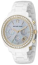 Buyer guide for Michael Kors Quartz, Mother of Pearl Dial with White Acrylic Band - Womens Watch MK5187 Round goldtone stainless steel case and white acrylic bracelet Mother of pearl dial features goldtone accents, the numeral twelve, goldtone stick indices and hands, date window, and three multifunction sub dials Water resistant to 50